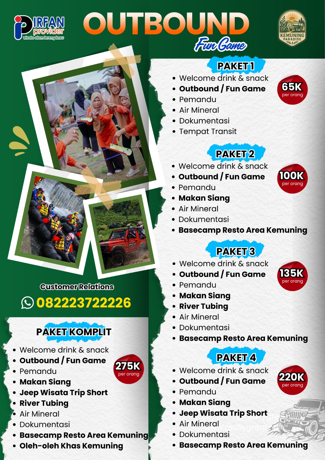 Pilih aktivitas wisata Anda, mulai dari serunya Jeep Adventure, paket Outbound, hingga Paket gabungan keduanya!